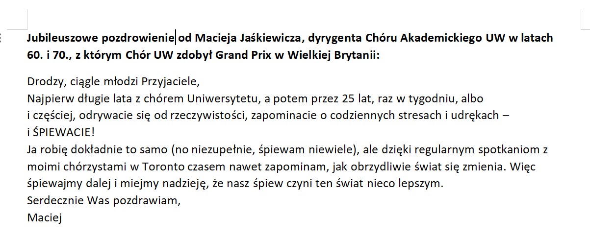 List gratulacyjny przysłał b. dyrygent Maciej Jaśkiewicz z Toronto. Poniżej zamieszczamy list oraz kilka zdjęć z koncertu. (M.L.)