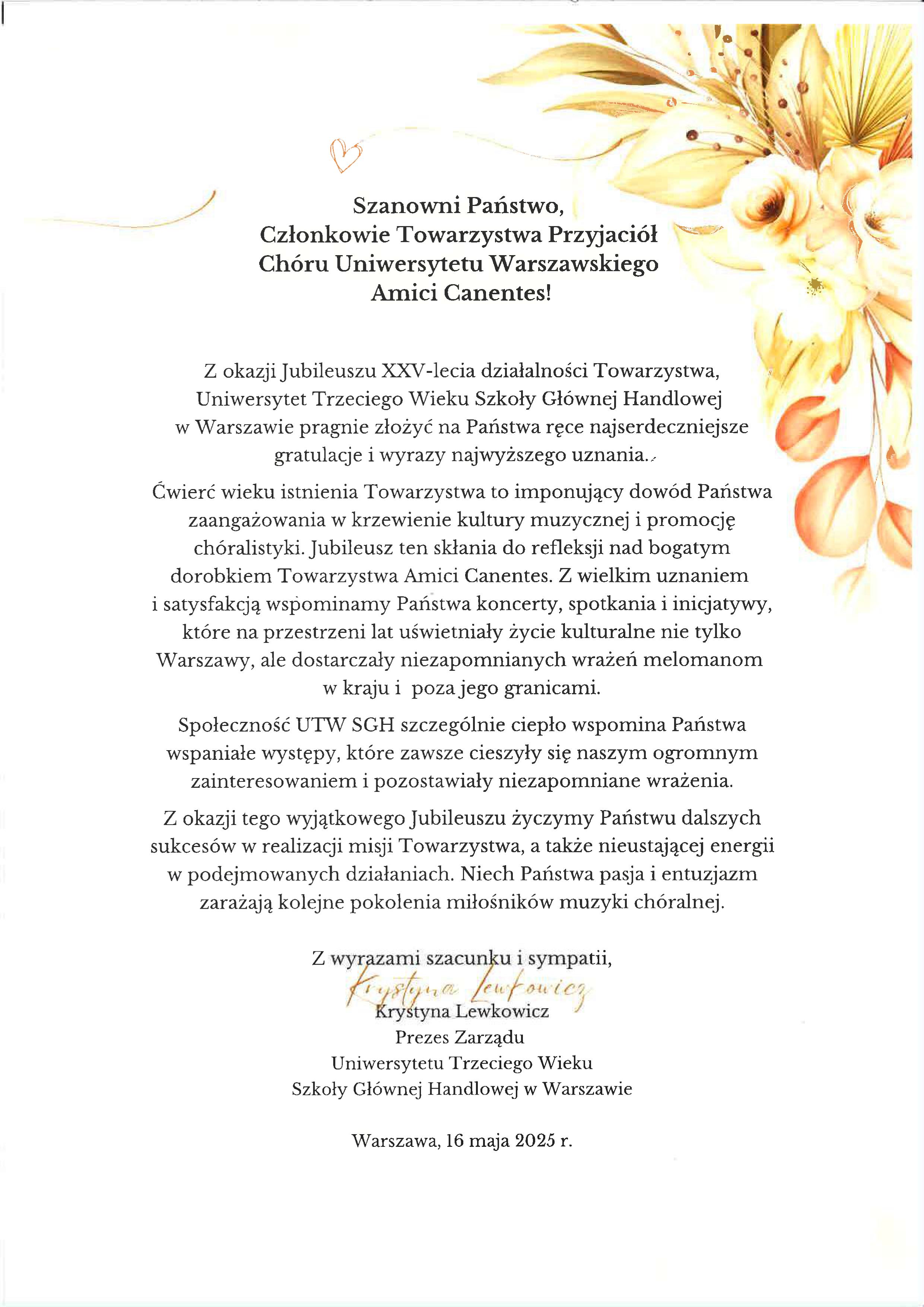 Wiosenny koncert Amici Canentes na zaproszenie Uniwersytetu Trzeciego Wieku SGH - 16 maja 2025